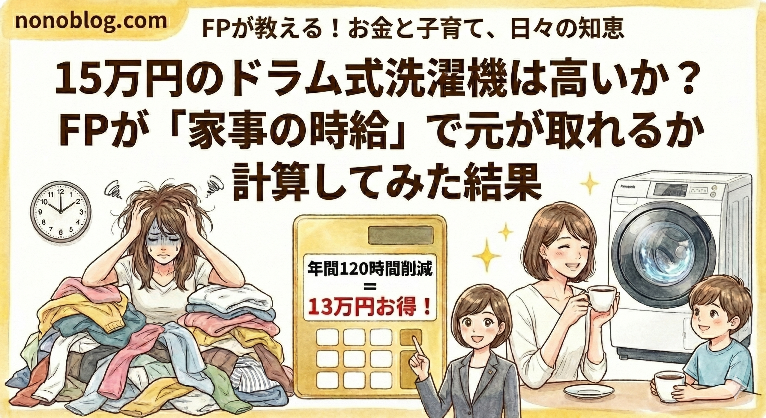 15万円のドラム式洗濯機は本当に高いのか。FPが家事の時給換算で投資回収を計算。年間120時間の時短効果、電気代・水道代の比較、購入タイミングの狙い方まで、家計視点でドラム式洗濯機の損得を検証。