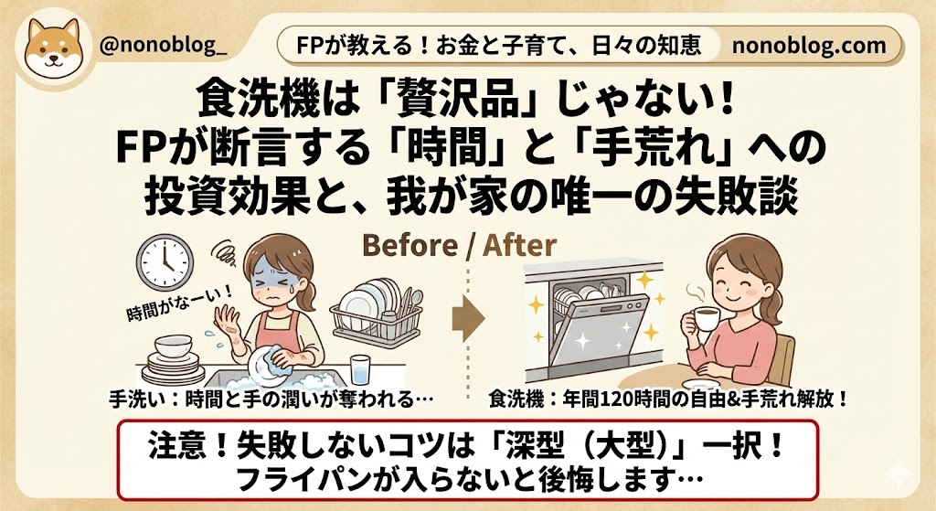 食洗機は贅沢品ではなく最強の時短投資です。FPが年間120時間の節約効果、光熱費の削減額、ビルトインと据え置き型の選び方、失敗しない導入のコツを具体的な数字で解説します。